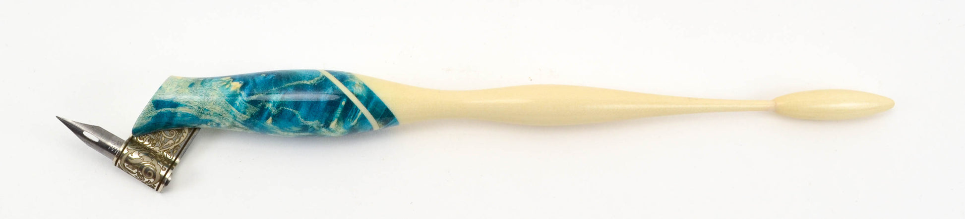 Expertly crafted from box elder burl and American holly, this right-handed oblique pen holder is designed for optimal performance. With bias cut body joints and a laser engraved nib flange, this pen holder offers precision and style for calligraphy and other writing applications.