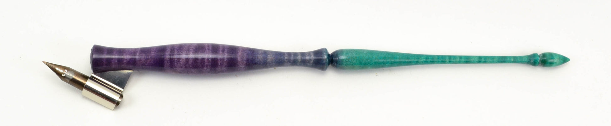This petite oblique pen holder is perfect for right-handed writers. The nickel silver flange ensures a smooth writing experience, while the unique purple and aqua dye adds a touch of personality to your calligraphy. Make your writing stand out with this stylish and functional pen holder.